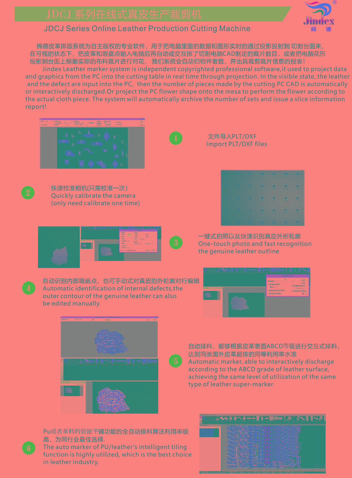錦德全自動(dòng)真皮裁剪流水線系統(tǒng)采用最先進(jìn)的高清全彩真皮輪廓采集系統(tǒng),通過高精度掃描提取真皮不規(guī)則輪廓形狀、面積、瑕疵等信息,配合全自動(dòng)排料系統(tǒng),產(chǎn)生最優(yōu)化的裁剪方案,獨(dú)特的三段式流水工作平臺,可以發(fā)揮最大裁剪效能,減少勞動(dòng)強(qiáng)度,提升綜合使用能效,裁剪效能較傳統(tǒng)真皮裁剪設(shè)備提升120%以上。